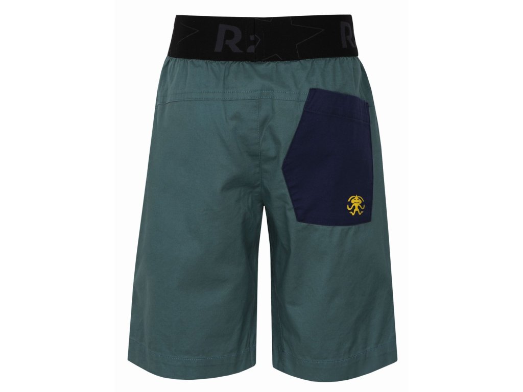 Lezecké dětské bavlněné kraťasy v pase do gumy s výraznou zadní kapsou, hodící se pro bouldering i lezení s lanem