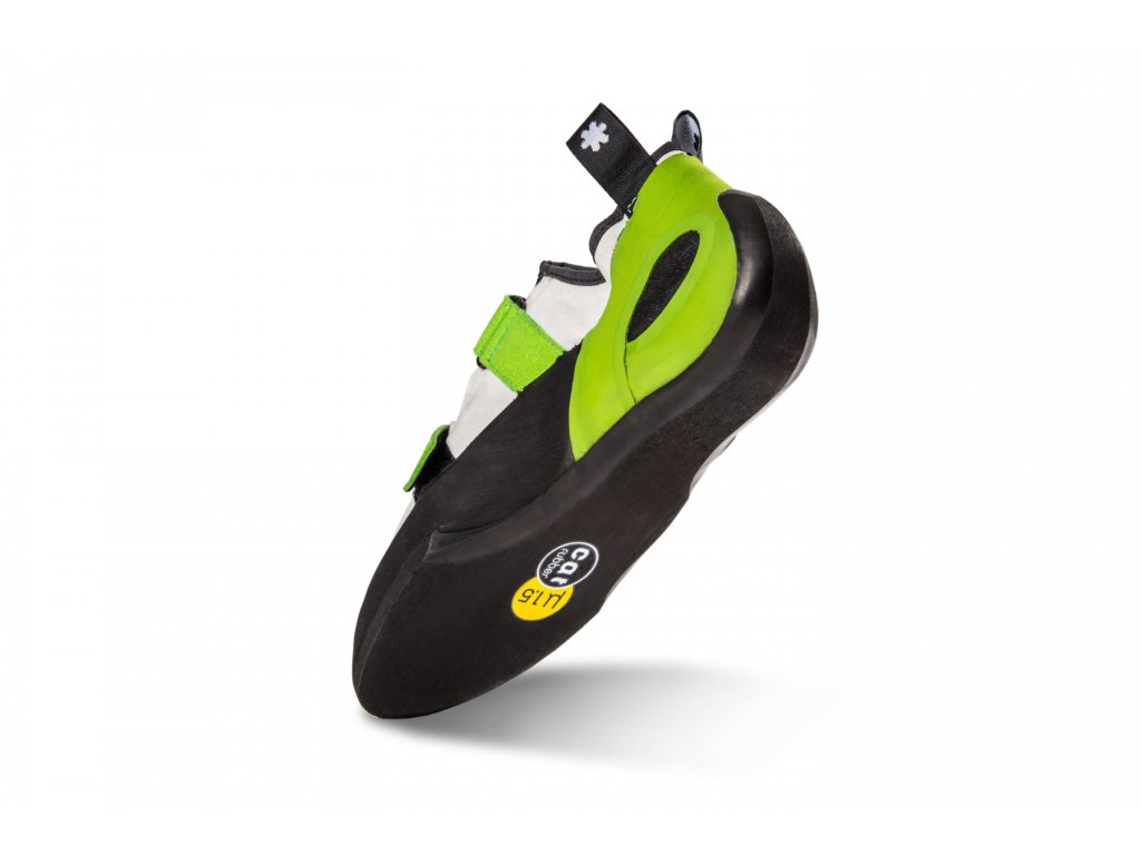 Perforovaný jazyk, podlepený pružnou textilií zaručuje prodyšnost i v teplých podmínkách. Bezešvá pata a dva suché zipy zlepšují fixaci nohy a nazouvání. Pogumovaná je celá lezečka, s vysoce přilnavou podešví ze směsi CAT 1.5