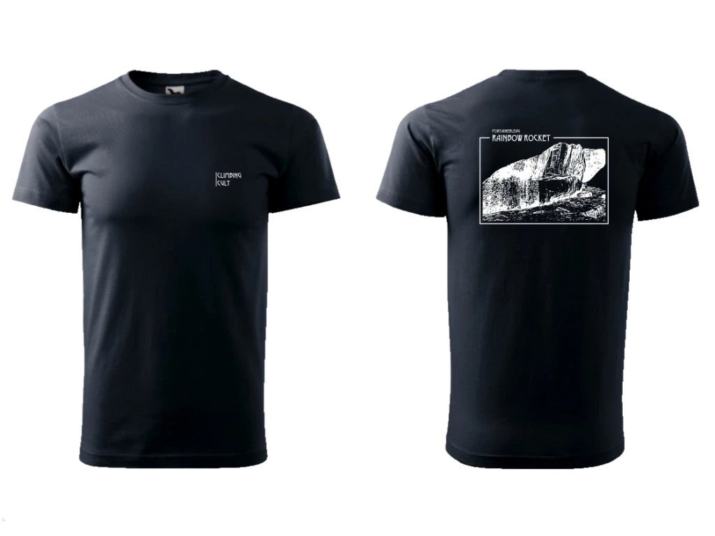 Triko s potiskem pravděpodobně nejznámějšího dynamickýho boulderu na světě. Rainbow rocket.